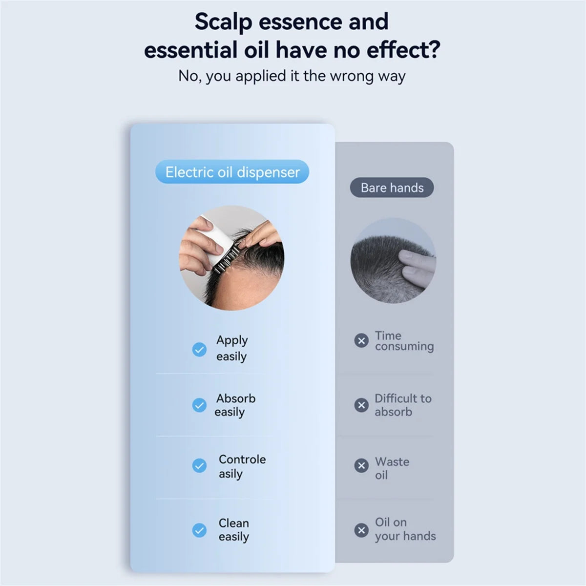 [70ml Liquid Storage Capacity & Direct Application]: Equipped with a 70ml storage bottle, this hair oil applicator allows you to replace your bottle or store your treatment medicine for longer use. With the advanced pump , press 3-5 times to dispense the liquid to the viewing window which holds a 2ML capacity, exactly the amount of daily treatment needed without wastage. [Precision & Efficiency with Elastic Liquid Teeth]: Provided with four elastic liquid teeth, the applicator directs the oil or treatment directly to the hair in place of just the , ensuring even distribution without mess. perfect for use with , essence, conditioner, nutrient solution, and essential oils. [Enjoy Relaxing Scalp Massages with High Frequency Vibrations]: The electric scalp massager comes with three optional modes - experience a soothing scalp massage with 10,000/min high-frequency vibrations and eight massager teeth that meticulously work on your scalp, promoting hair growth. The storage tank comprises material with no chemical reaction with liquid medicines. [Fast Charging & ]: The applicator comes with a type-C charging cable, ensuring a full charge within an hour. It works perfectly even during charging. The charging port and the device are IPX5 , making it safe to rinse directly after each use. Please clean promptly to avoid crystallization at the bottom of the comb teeth which could block fluid discharge. [Elegant Design & Portable]: hair oil applicator features a long cylinder shape that's comfortable to hold and easy to carry. It fits comfortably in hand, is easy to store in your handbag, and offers a massage anytime, anywhere. Colour:White Material:ABS Package Contents: 1 * scalp massager oil applicator 1 * charging cable Only the above package content, other products are not included. Note: Light reflection and different displays may cause the color of the item in the picture a little different from the real thing. The measurement allowed error is +/- 1-3cm.